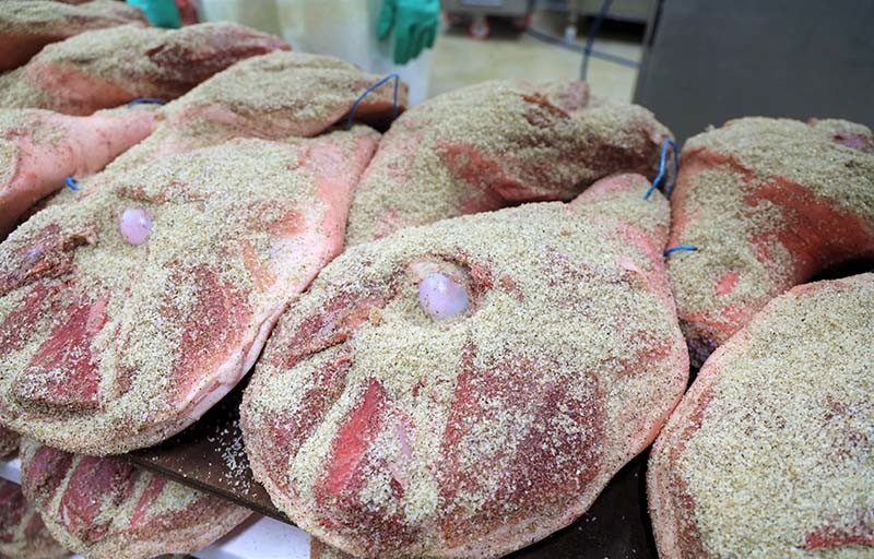 La carne fresca, dopo essere stata rifilata con cura, viene messa sotto sale assieme agli aromi naturali.